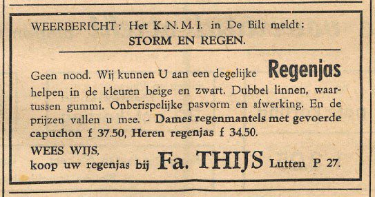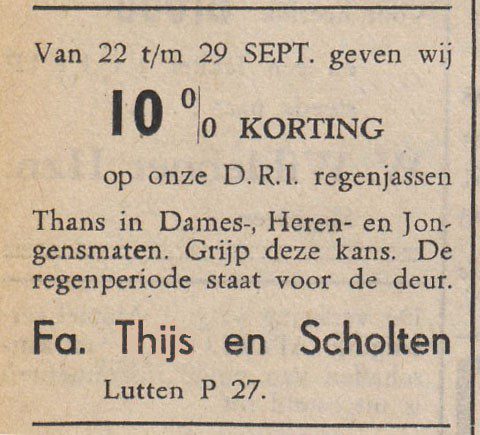 Al vrij snel na hun intrek in Lutten adverteerde Jan Scholten op 3 november 1911 in het Sallands Volksblad. Uit de advertentie blijkt wat men zoal verkocht.