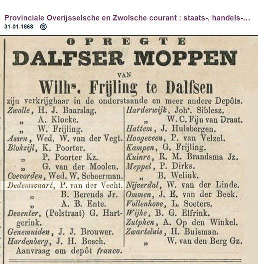 Pieter van der Vecht was niet alleen brievengaarder, maar ook koopman en vervener. In het boekje: “150 jaar Hervormde Gemeente van Lutten” lezen wij, dat Pieter van der Vecht prima kwaliteit vijfschacht verkocht, waarvan rokken werden gemaakt. Over het vervenerschap van Pieter schrijft Wim Visscher in “Hassels Historiael” en in “Een wereld van turf”. Waarschijnlijk heeft Pieter van der Vecht veel eigen gereedschappen gehad, die bij de turfwinning werden gebruikt. Om vervreemding van stikkers, opleggers en kruiwagens te voorkomen, werden voorwerpen met een brandijzer gemerkt. Nu meer dan honderdvijftig jaar later weet dit stempel van Pieter ons nog te stigmatiseren.