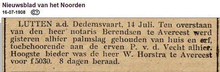 Toen Willem Horstra in 1908 de woning met winkel kocht van de erven van der Vecht, t.w. Kaatje en Leida, was Willem Horsta op leeftijd. Hij was toen bijna 64 jaar. Willem Horstra en zijn vrouw Lammigje trokken op 10 maart 1909 dus in de woning samen met hun dochter Rolina en hun schoonzoon Jan Scholten. Ook de drie dochters van Jan en Rolina verhuisden mee naar Lutten a/d Dedemsvaart. Hun nieuwe adres werd P 28, later gewijzigd in P 32 en nog later in P31.