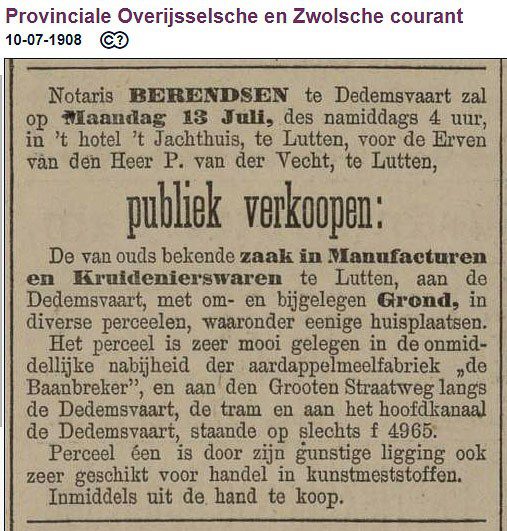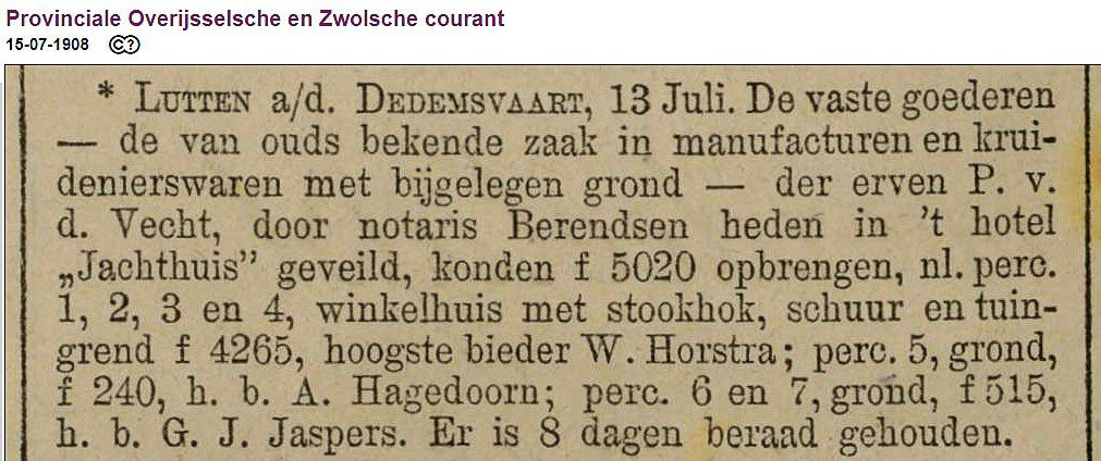 Uit de advertentie van 10-07-1908 blijkt dat er is ingezet op f 4.965,–. Eind juli 1908 werd het de winkel met woonhuis verkocht voor f. 5.030,–.