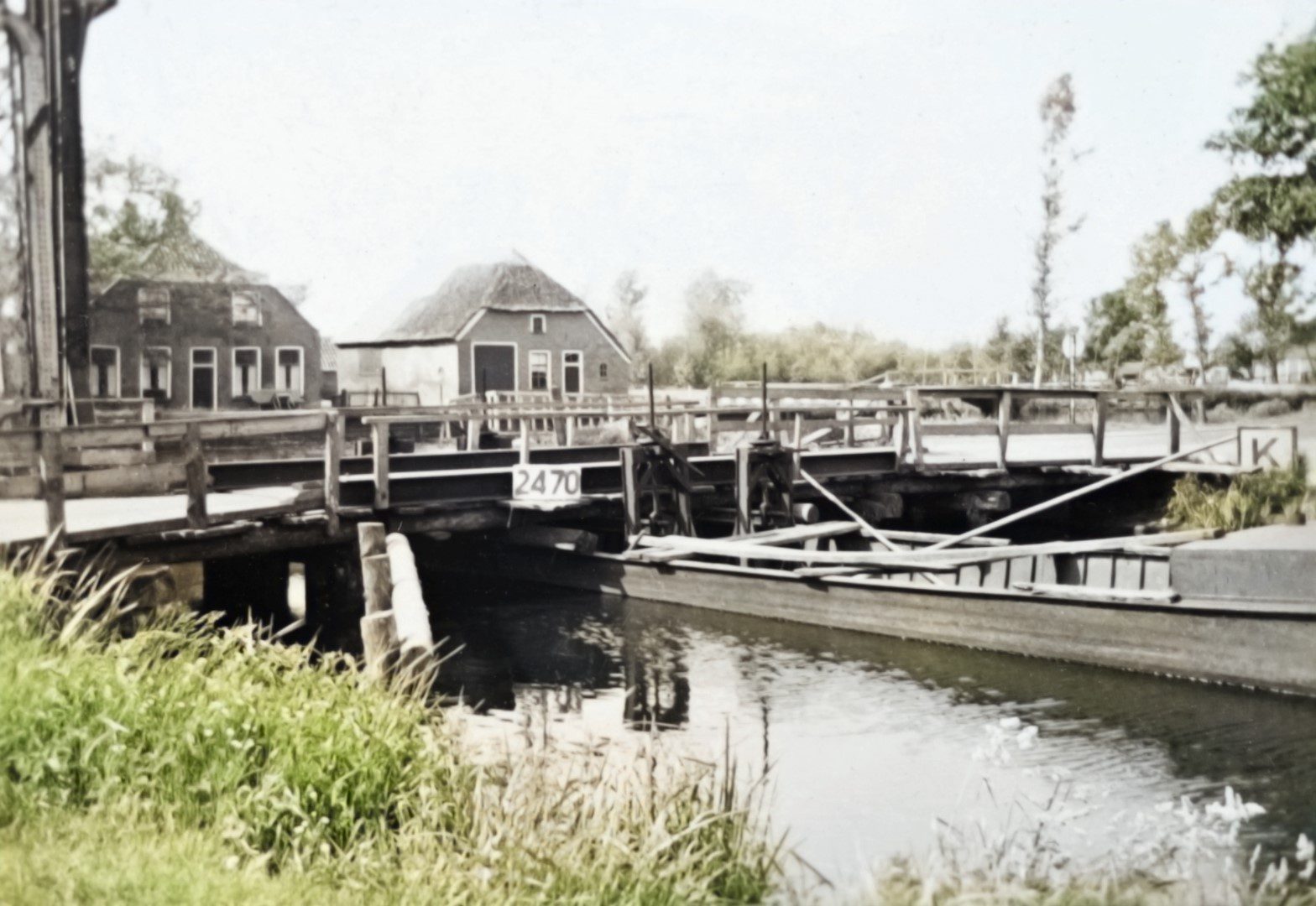 Noodbrug 1945 voor gewoon verkeer over de Lutterhoofdwijk in de weg Gramsbergen-Dedemsvaart. Mooi vooraanzicht van de oude boerderij van Hofsteenge aan de zuidkant van het kanaal de Dedemsvaart.